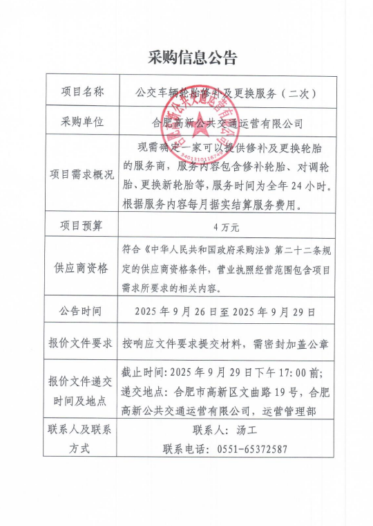 报价等要求详见采购信息公告PDF。 公交车辆轮胎修补及更换服务采购信息公告(二次).pdf ...