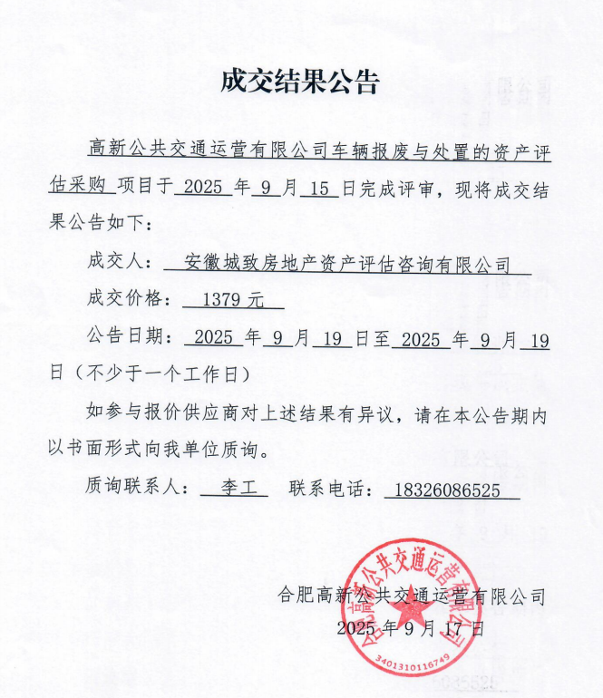 高新公共交通运营有限公司车辆报废与处置的资产评估成交结果公告