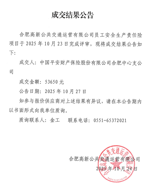 合肥高新公共交通运营有限公司员工安全生产责任险项目成交结果公告