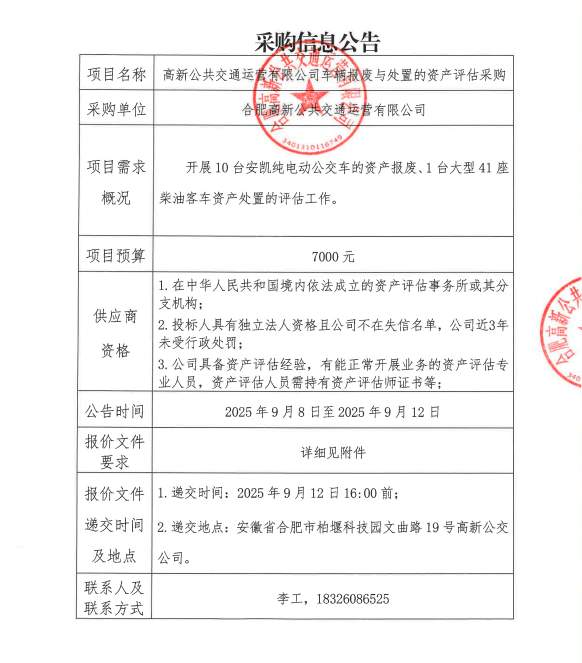高新公共交通运营有限公司车辆报废与处置的资产评估采购信息公告