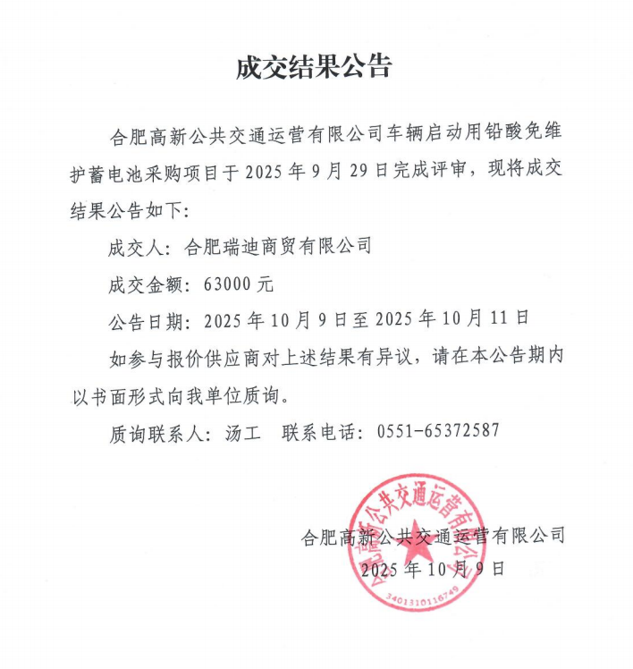 车辆启动用铅酸免维护蓄电池采购成交结果公告